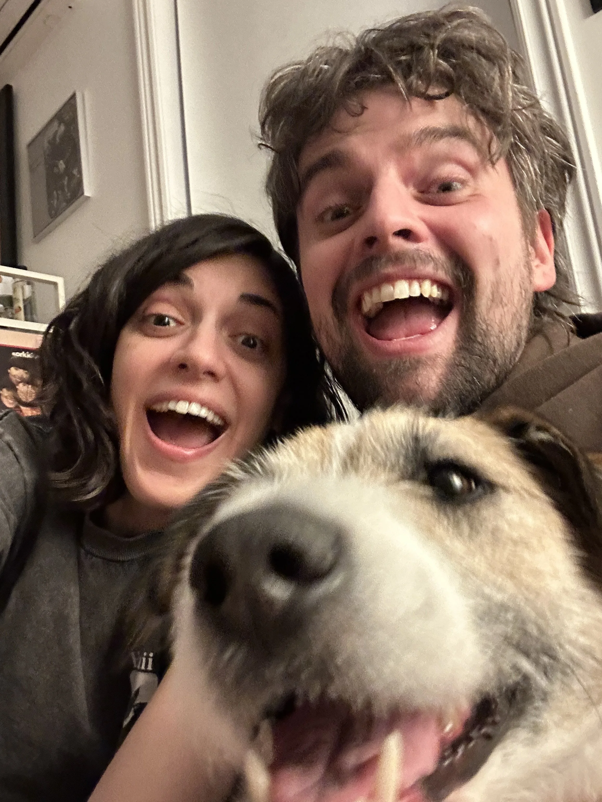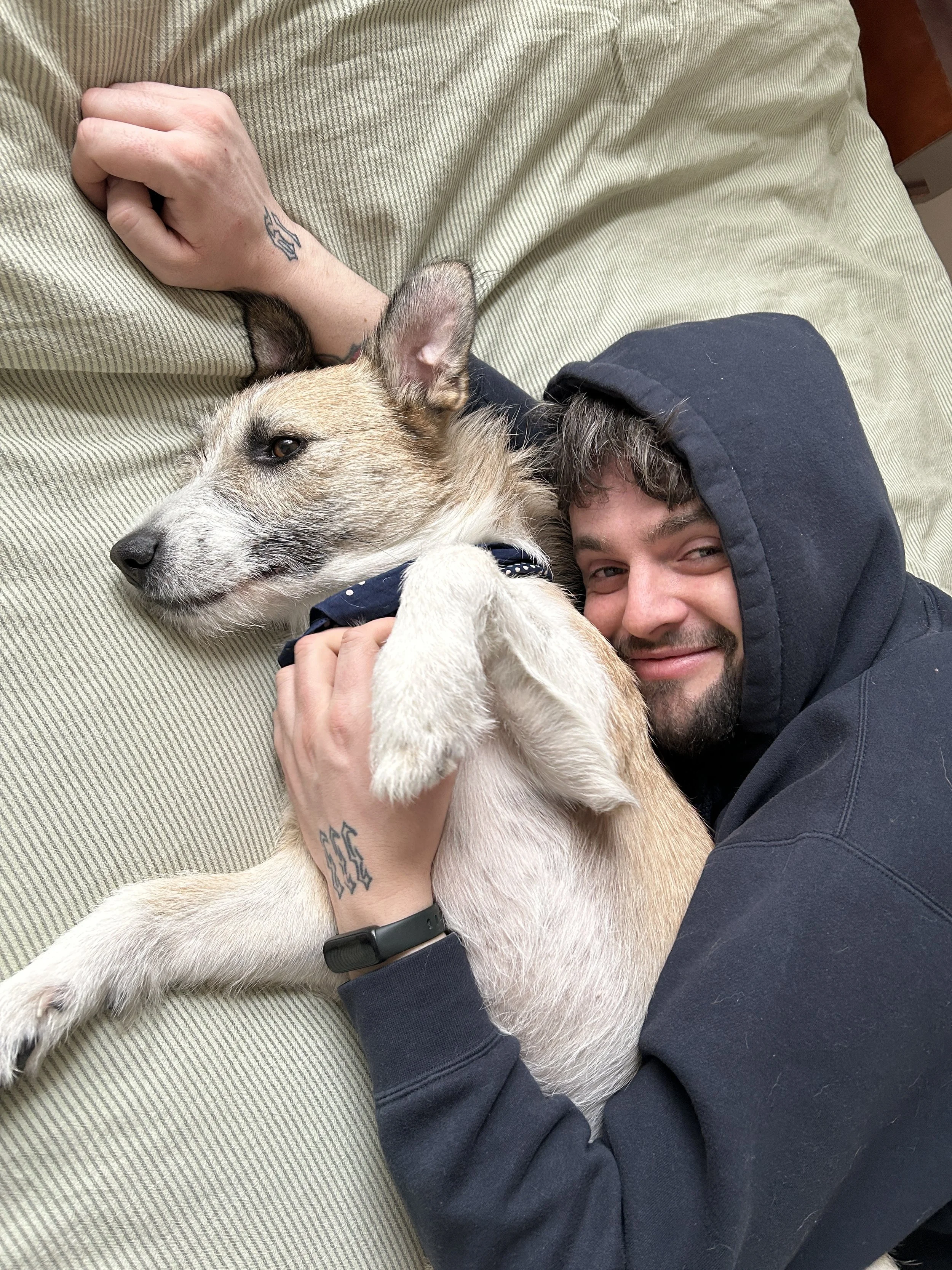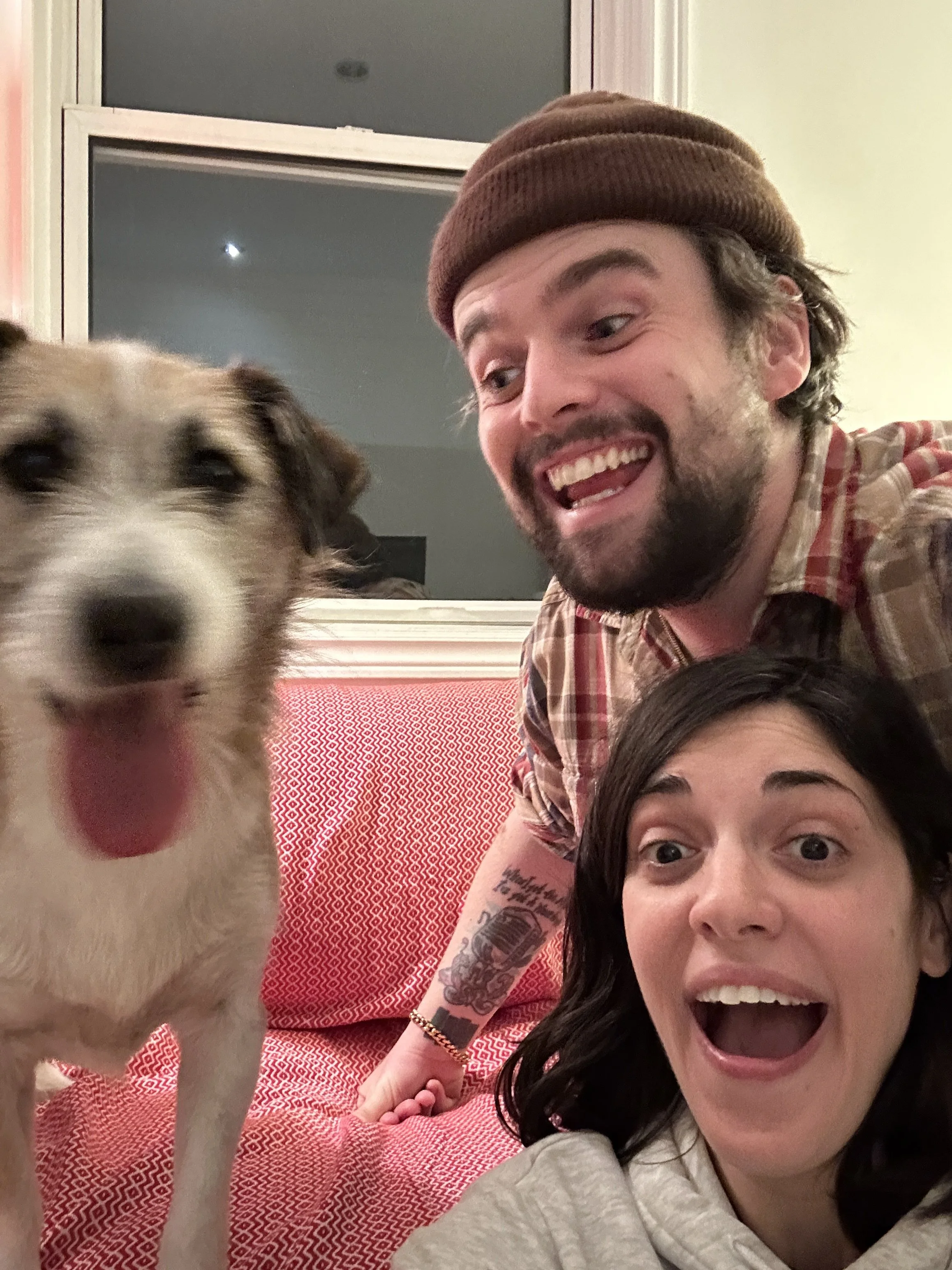 The first time they saw Séamus’s face, he was looking up through the door on his (very spacious) flight crate. His head was down and his ears were back but his eyes were looking right at Charlie and Gökçe. It was clear he was full of love but wasn’t sure who to trust just yet. He got his post flight meal, did the world's biggest pee on a huge, indoor concrete airport pole and they were a family. He was scared and tried to run when the car door opened but was quickly convinced with a liver treat, something that works to this day.