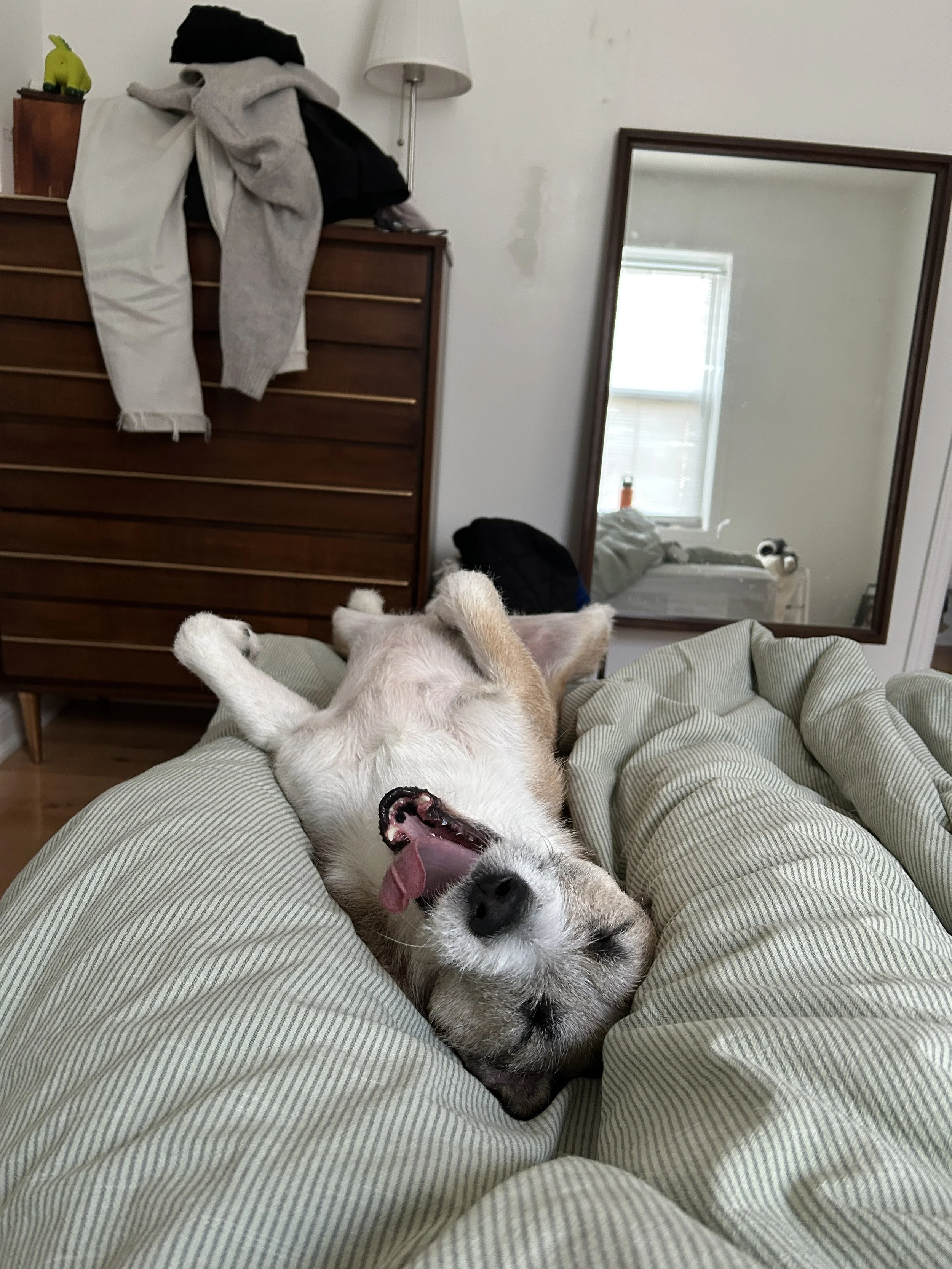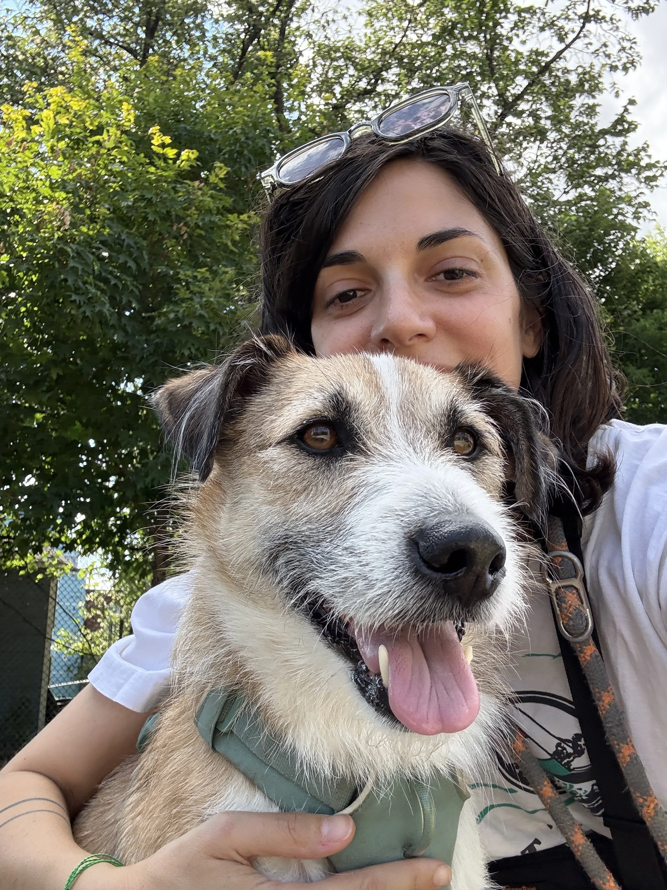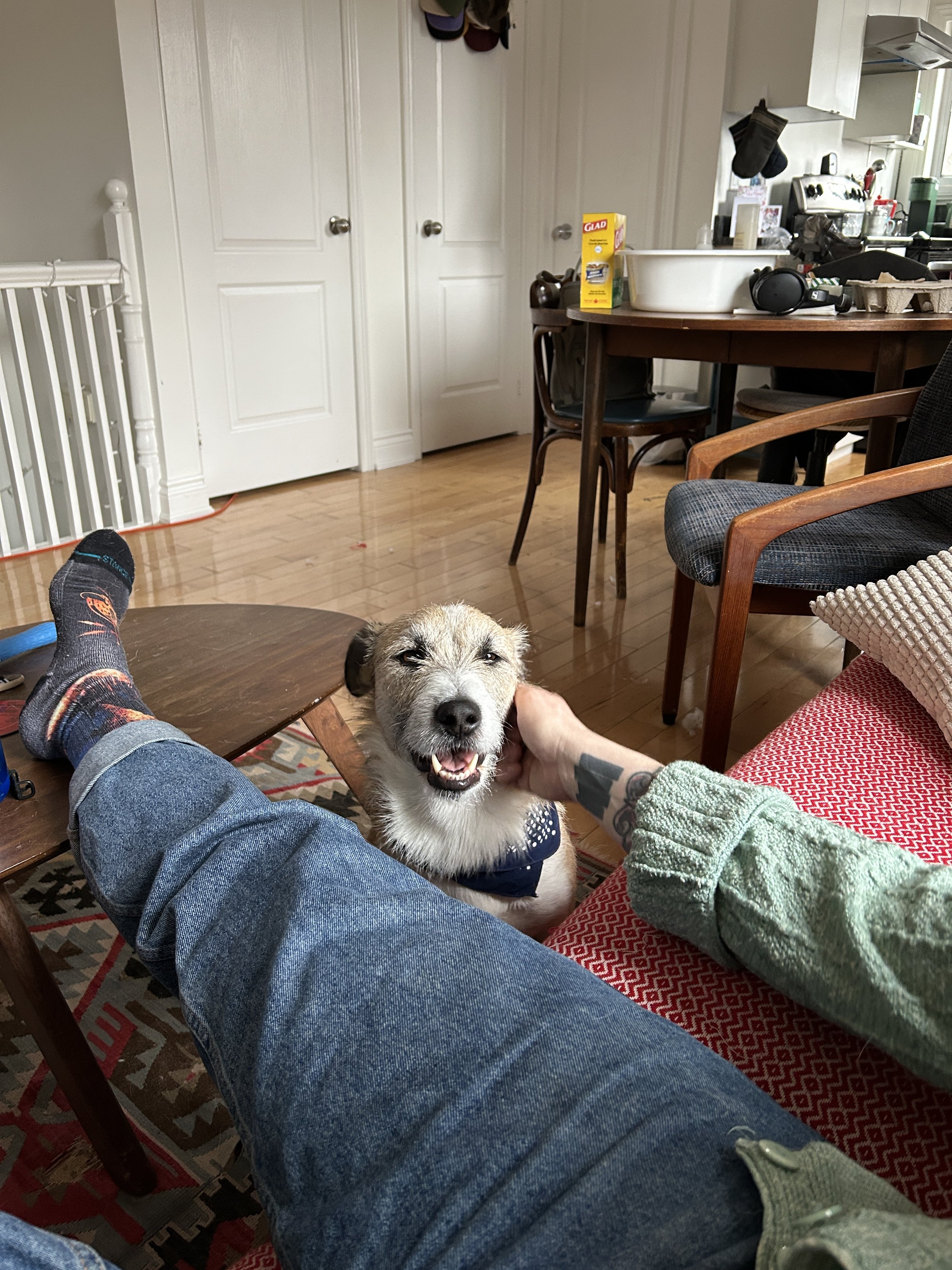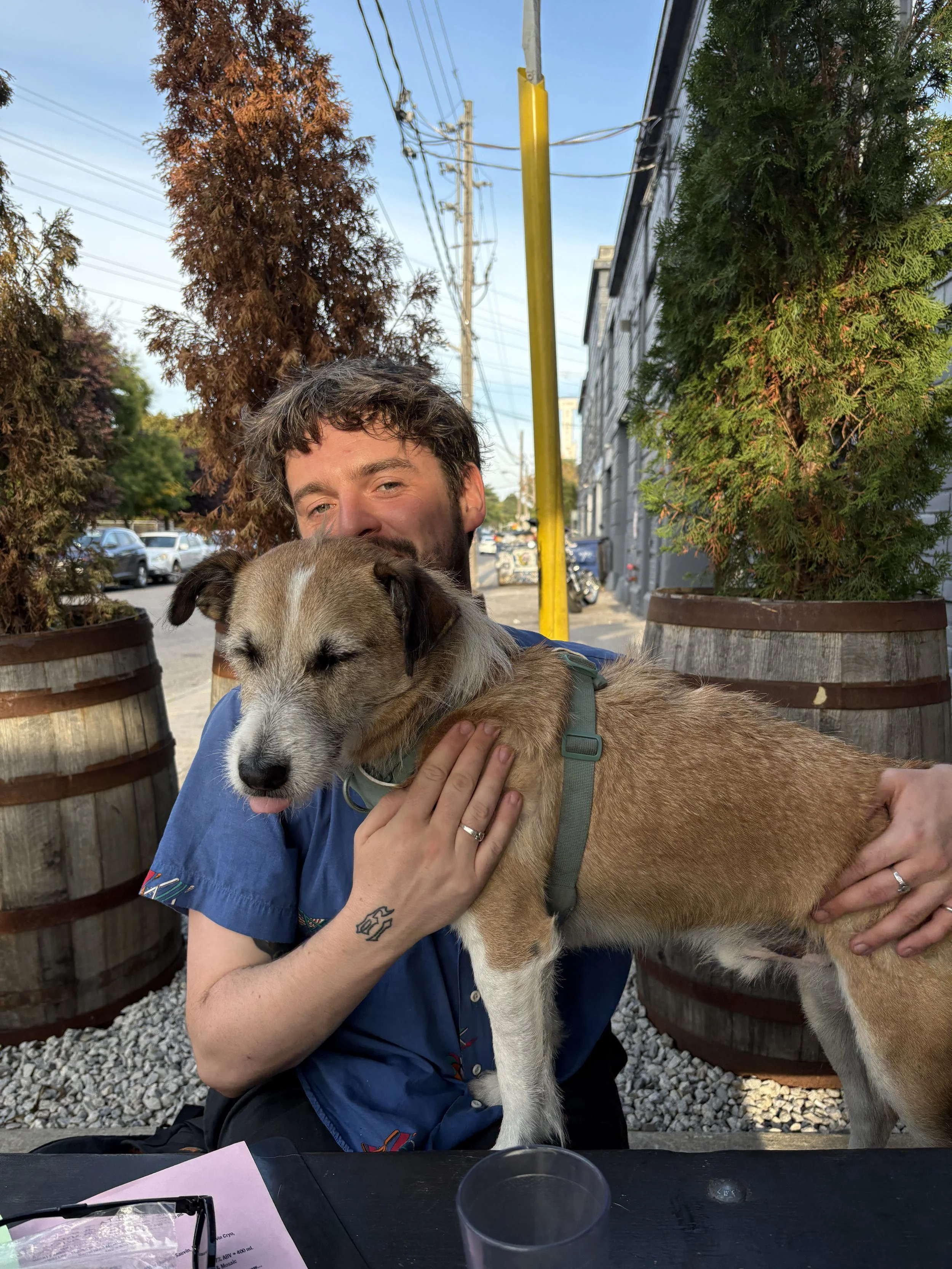 The first time they saw Séamus’s face, he was looking up through the door on his (very spacious) flight crate. His head was down and his ears were back but his eyes were looking right at Charlie and Gökçe. It was clear he was full of love but wasn’t sure who to trust just yet. He got his post flight meal, did the world's biggest pee on a huge, indoor concrete airport pole and they were a family. He was scared and tried to run when the car door opened but was quickly convinced with a liver treat, something that works to this day.