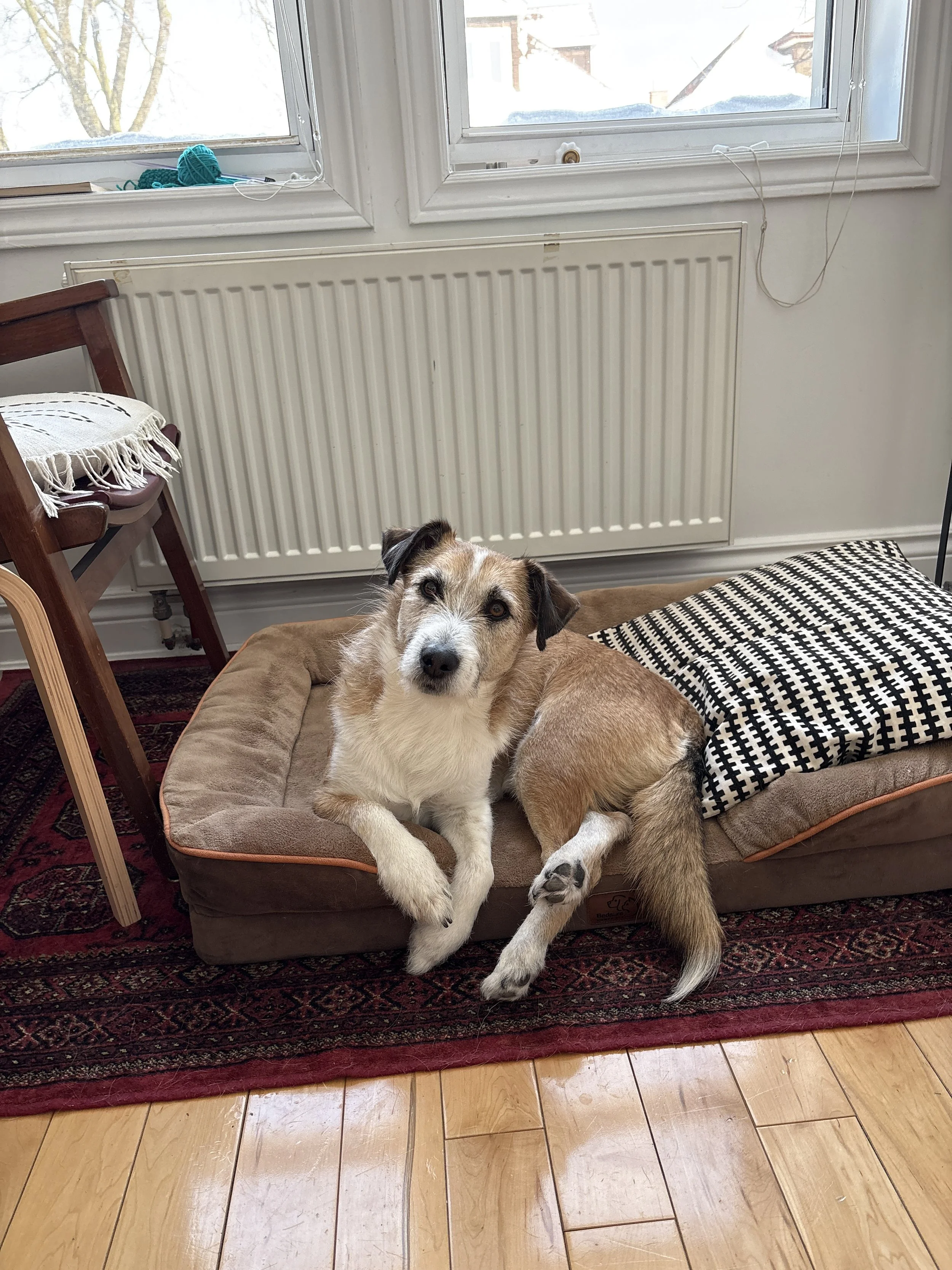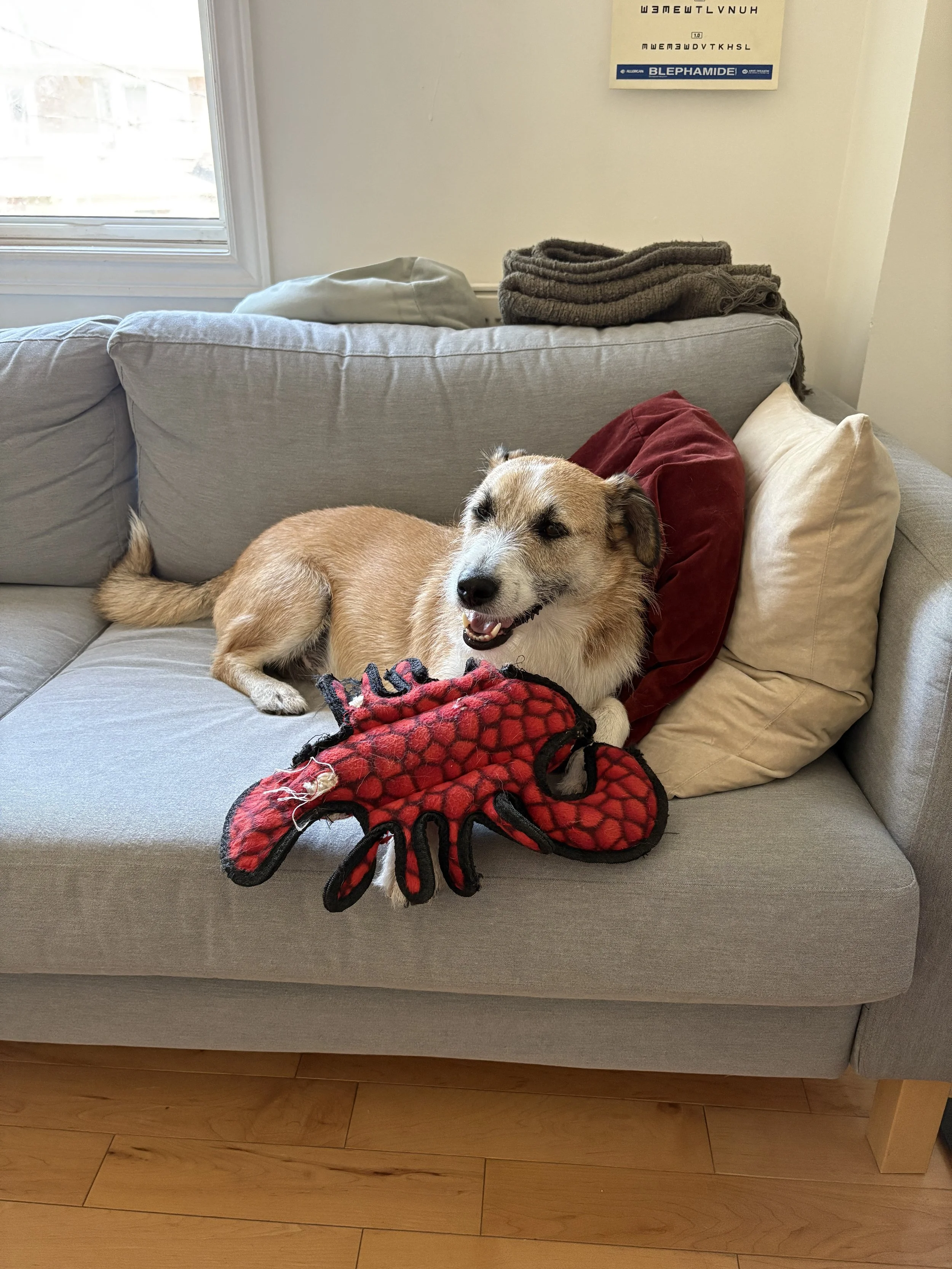 He spends his days in Toronto playing with his favourite lobster toy, demanding constant rubs, running through High Park and continuing his never ending hunt for street bones (they’re also working on that lol).